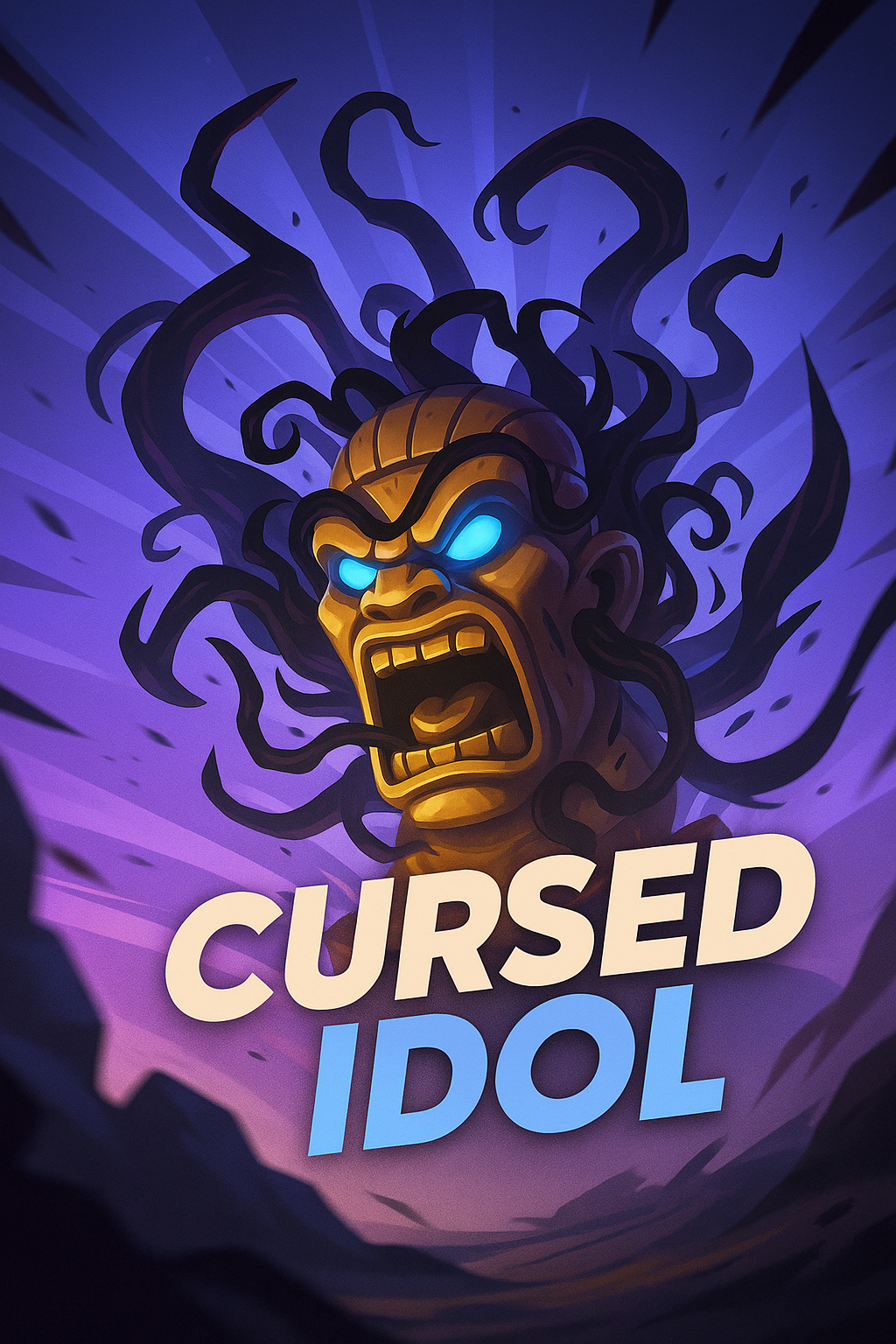 /Collection: /by davooda/Type: PNG/A vibrant illustration of a cursed idol with swirling dark hair and glowing blue eyes, surrounded by dynamic lines emanating from the center. The title 'Cursed Idol' is displayed prominently in bold, engaging typography.