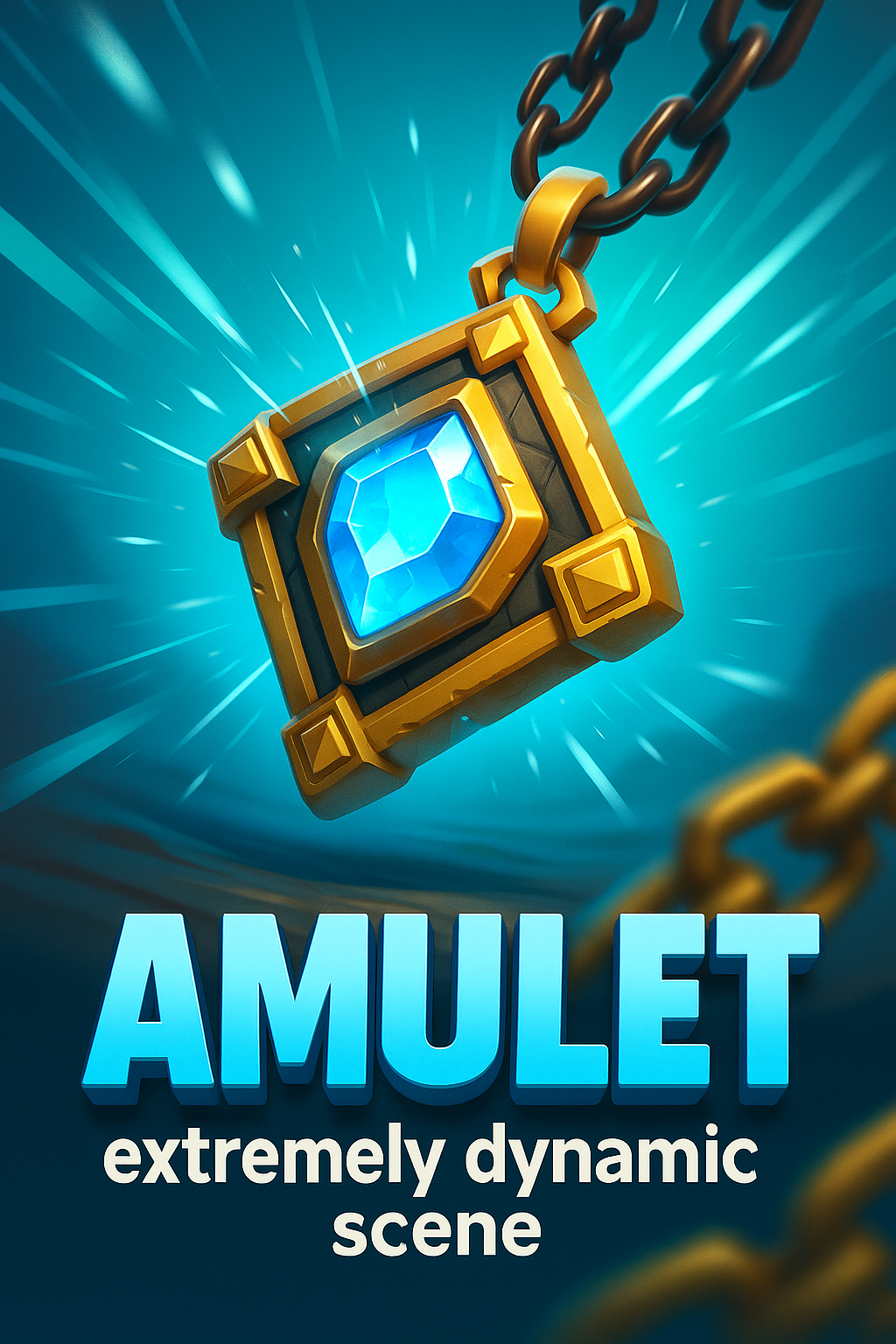 A striking 3D illustration of an amulet surrounded by dynamic rays of light. The design features a smooth gradient background and a bold, engaging title emphasizing the word 'AMULET'.