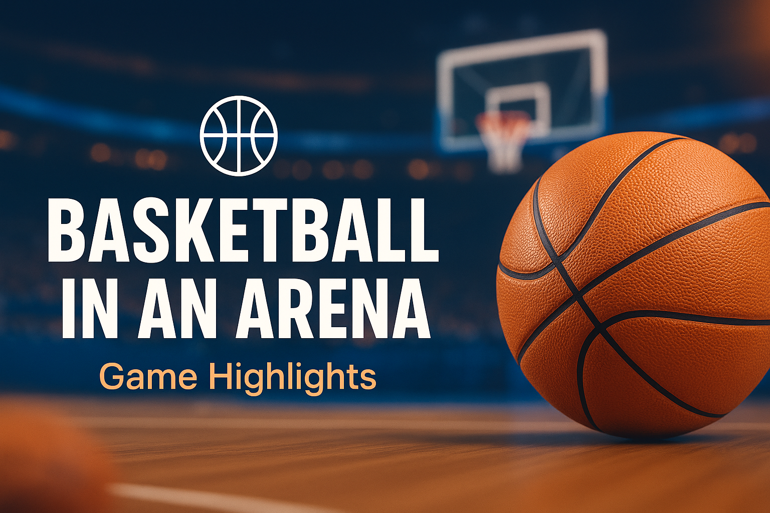 Engaging graphic depicting a basketball in an arena setting, emphasizing game highlights. Ideal for sports marketing, event promotions, or social media content.