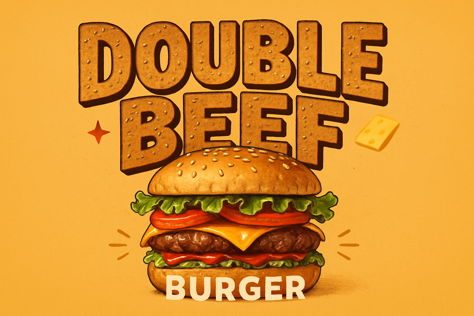 Vibrant graphic featuring a delicious double beef burger with toppings, designed in a playful style. Ideal for food promotions and restaurant branding.