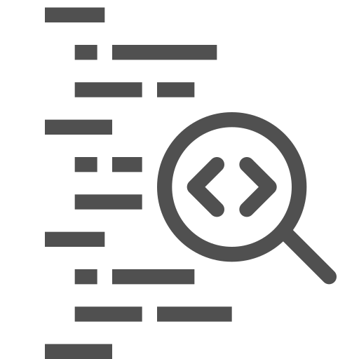 outline simple icon: code, code search, find, inspect, magnifying glass
