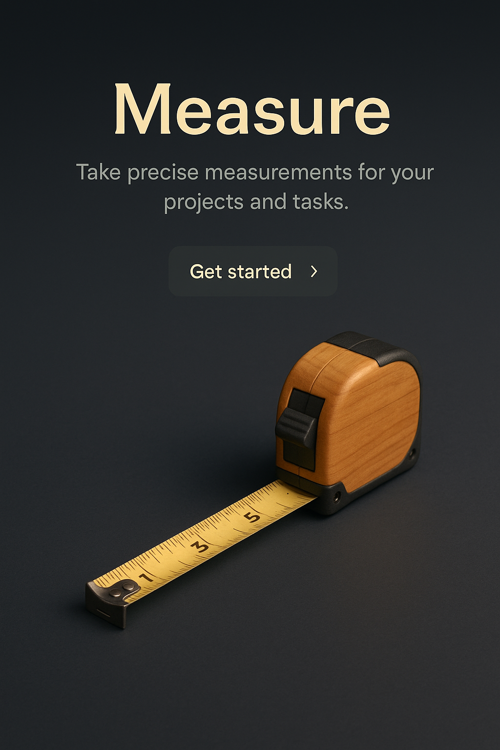 A detailed 3D scene showcasing a measuring tape against a dark gradient background. The design includes a small label and action button, creating a cohesive visual narrative.
