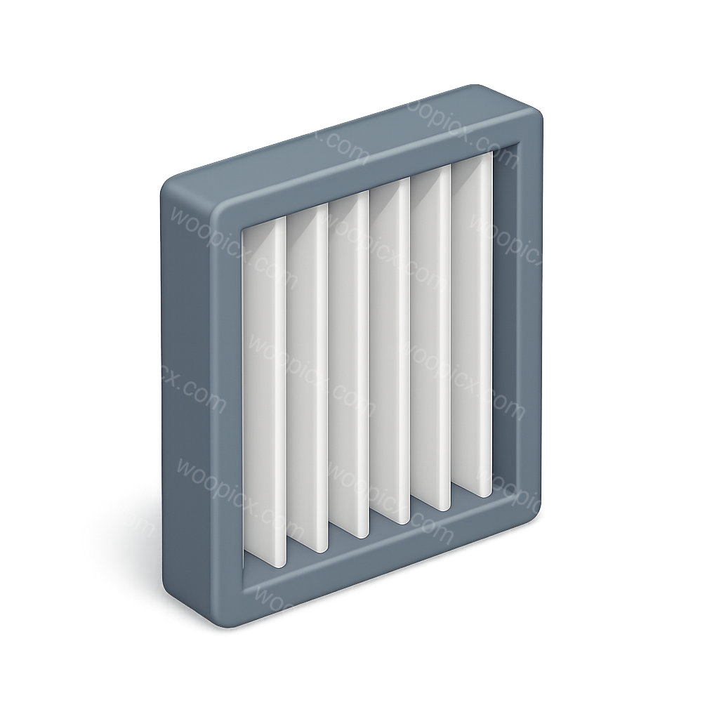 /Premium/Collection: /by davooda/Type: PNG/A visually appealing 3D icon of an air filter, designed with a transparent background. The icon features a three-quarter view with a volumetric and isometric feel, showcasing white filter elements within a gray frame.
