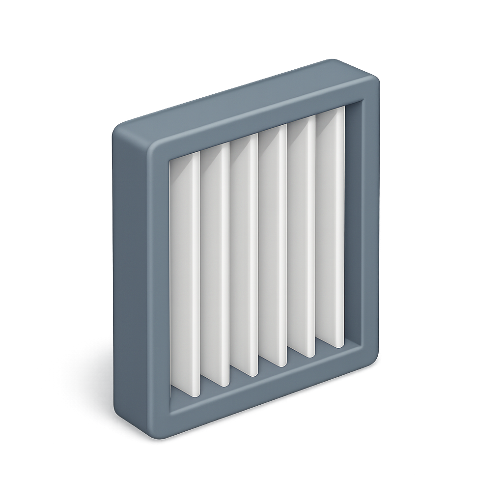 /Collection: /by davooda/Type: PNG/A visually appealing 3D icon of an air filter, designed with a transparent background. The icon features a three-quarter view with a volumetric and isometric feel, showcasing white filter elements within a gray frame.