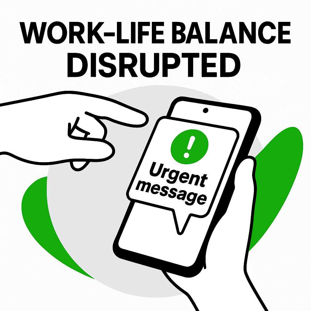 /Collection: /by davooda/Type: PNG/A modern graphic illustrating the disruption of work-life balance, featuring a hand interacting with a smartphone displaying an urgent message. Suitable for digital articles or presentations on wellness.