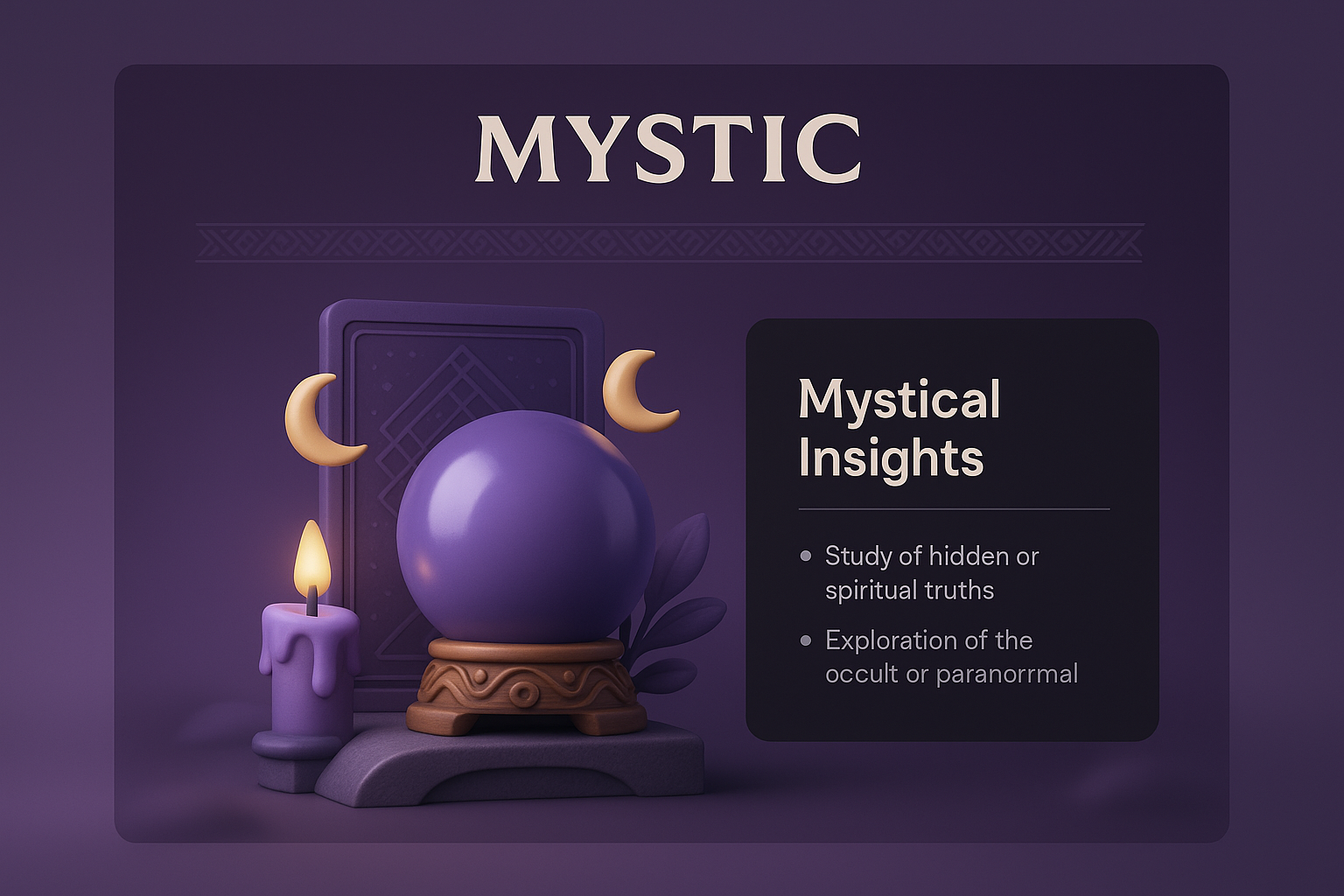 A captivating 3D web design featuring a crystal ball, candle, and decorative elements. Dark-themed layout includes informative text and artistic integration.