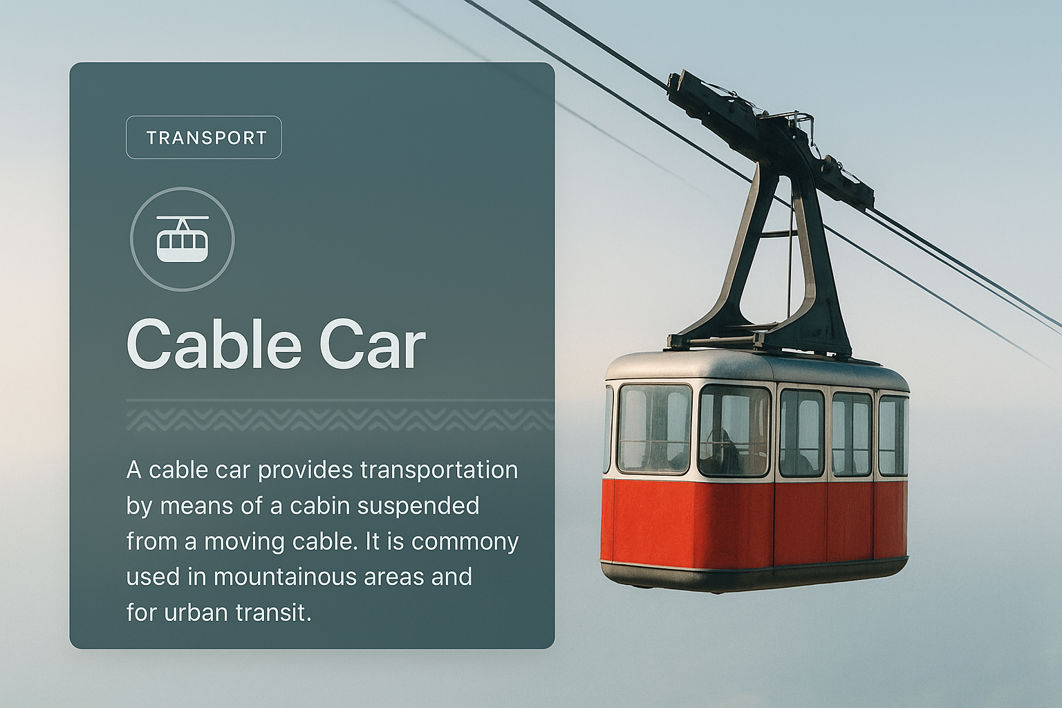 /Collection: /by davooda/Type: PNG/This image features a beautifully designed cable car against a soft gradient background. It integrates modern text blocks with clear readability, emphasizing transportation in mountainous areas.