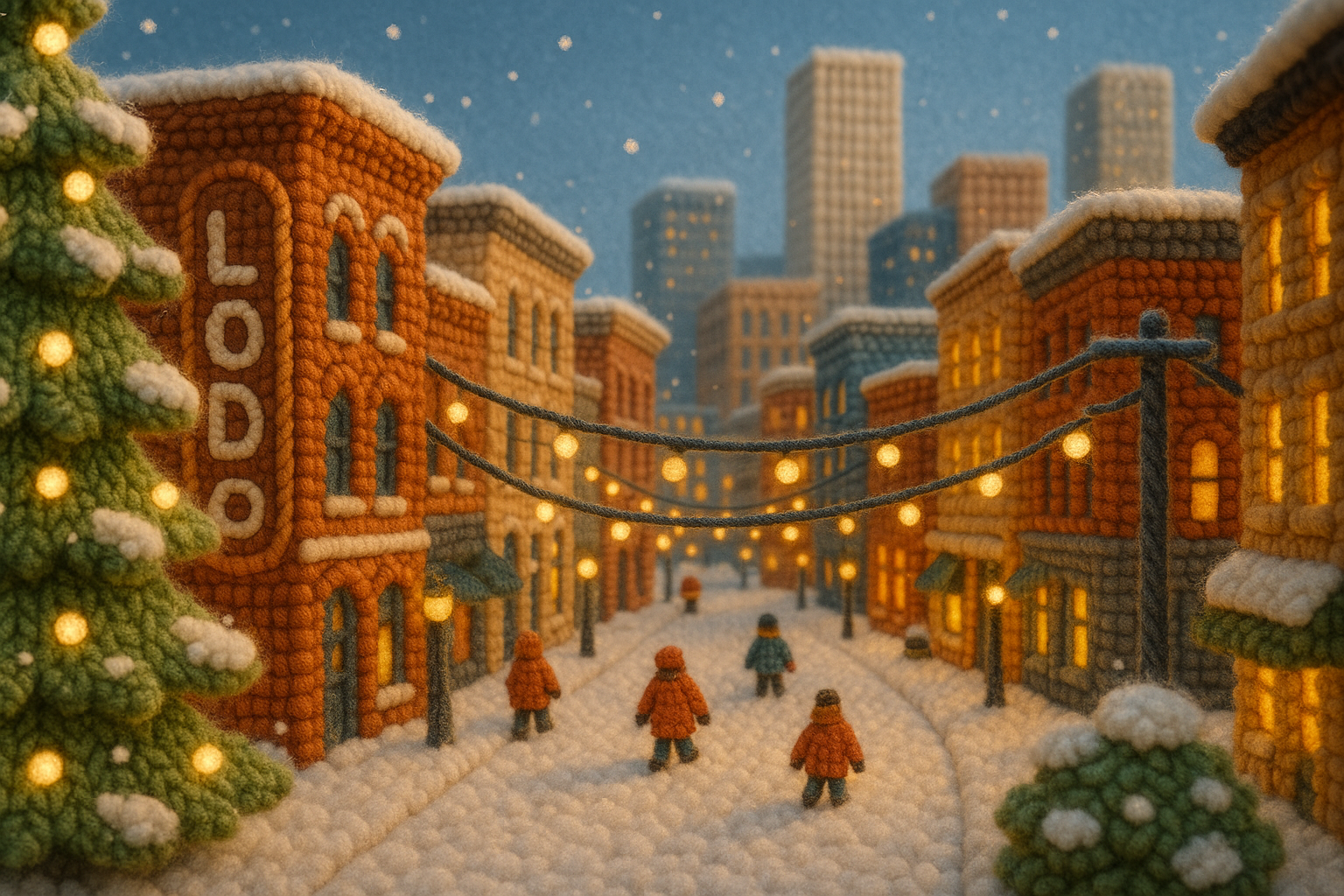 A charming 3D depiction of LoDo, Denver, featuring buildings made of fluffy yarn, with snowflakes gently falling and festive lights illuminating the scene. Small figures wander the snowy streets.