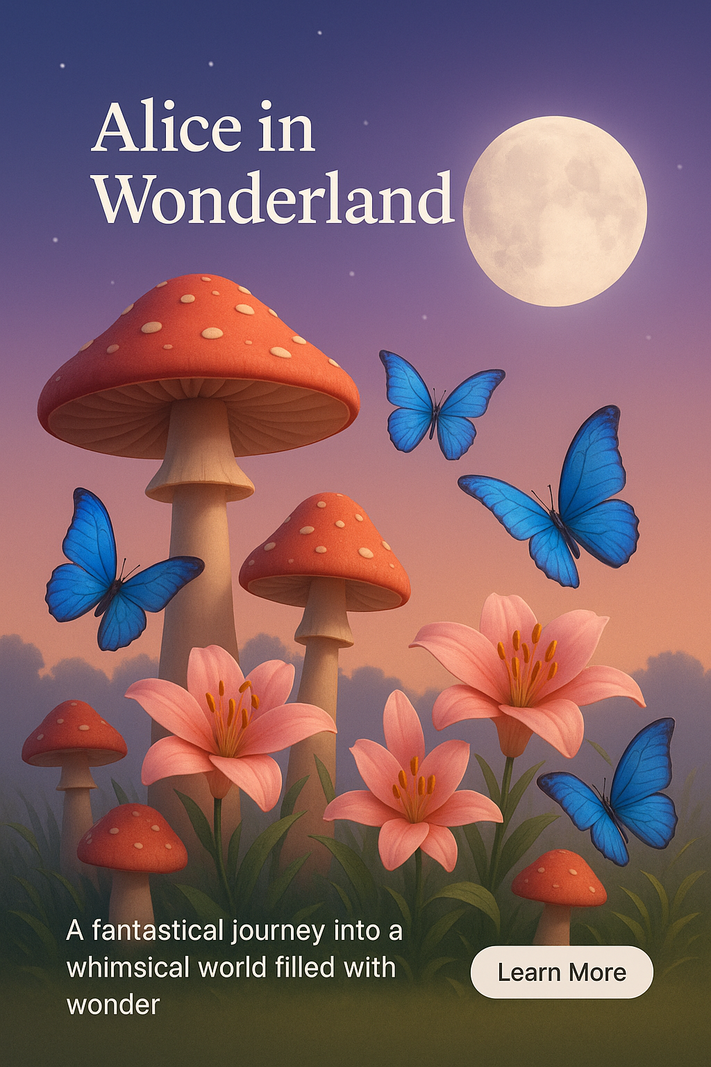 /Collection: /by davooda/Type: PNG/A serene illustration depicting a magical landscape with vibrant mushrooms, pink lilies, and morpho butterflies under a glowing moon, inspired by Alice in Wonderland.