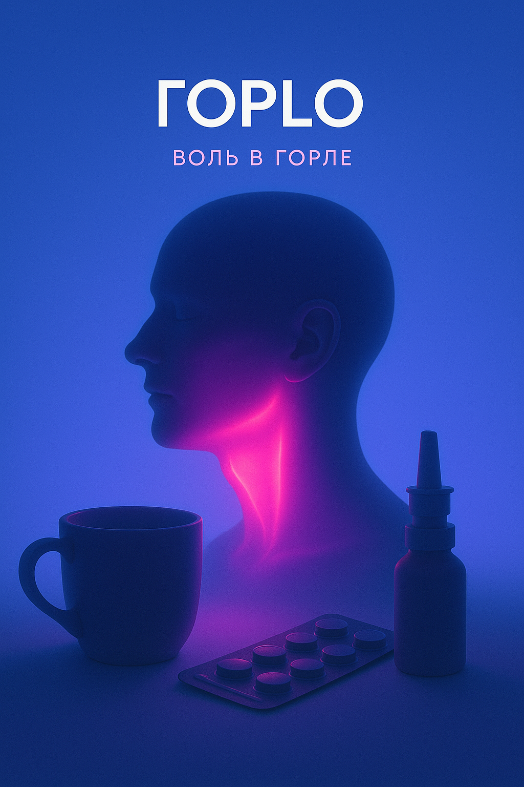 A surreal composition featuring a glowing throat silhouette amidst throat care items like a cup, medicine, and a nasal spray, all set against a solid blue background.