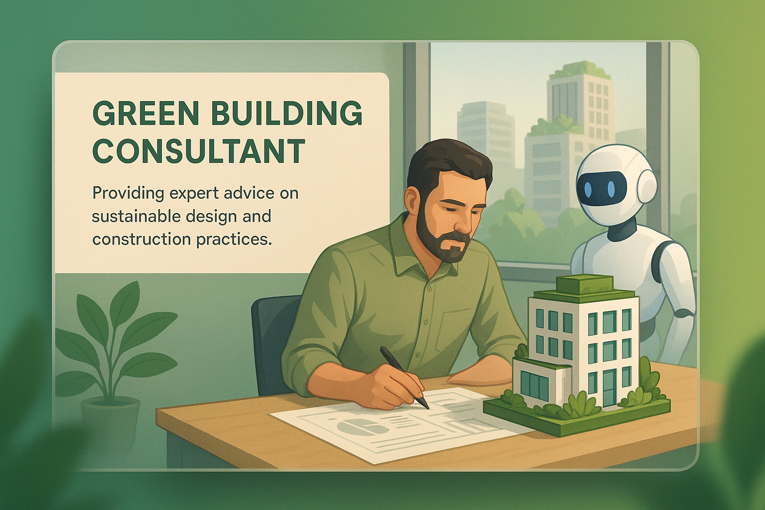 Green Building Consultant with AI Assistant in Modern Office Setting