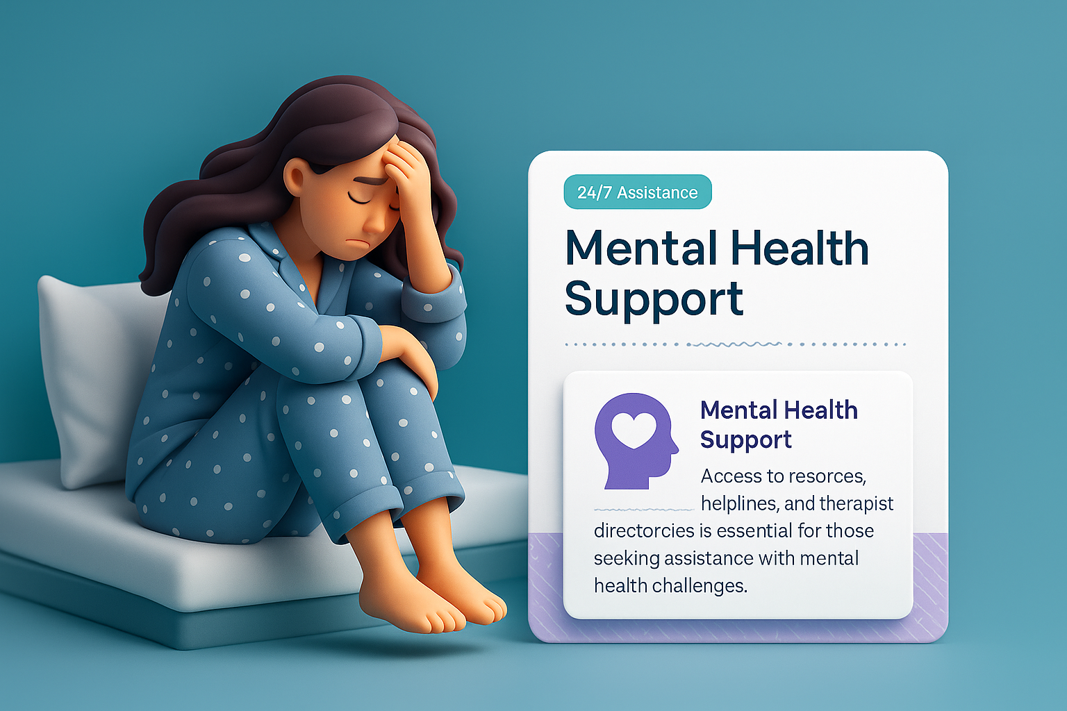 This image features a 3D illustration representing mental health support, showcasing a character in distress and a supportive message. Ideal for mental health awareness campaigns.