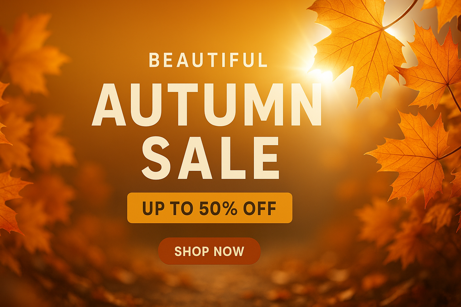 This vibrant banner showcases an autumn theme with golden leaves and a warm background, promoting a seasonal sale. Ideal for online retail and marketing.