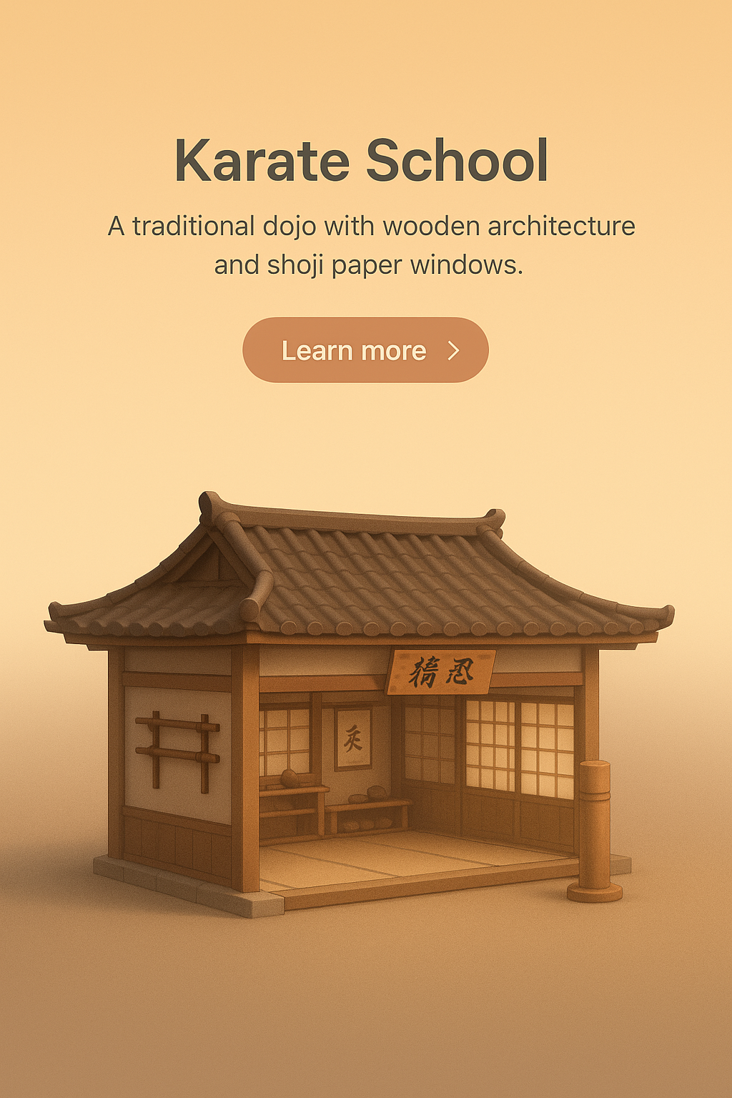 A detailed 3D illustration of a traditional Japanese dojo with wooden architecture and shoji paper windows, set against a smooth gradient background.