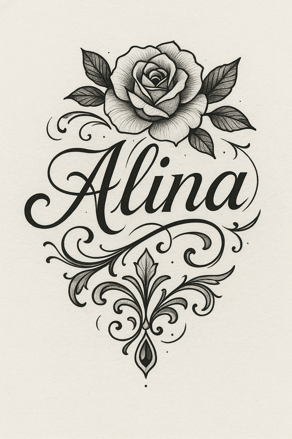 This image showcases a beautifully illustrated floral design with the name 'Alina' in an elegant script. It features intricate details and a vintage aesthetic, suitable for personal branding or decorative purposes.