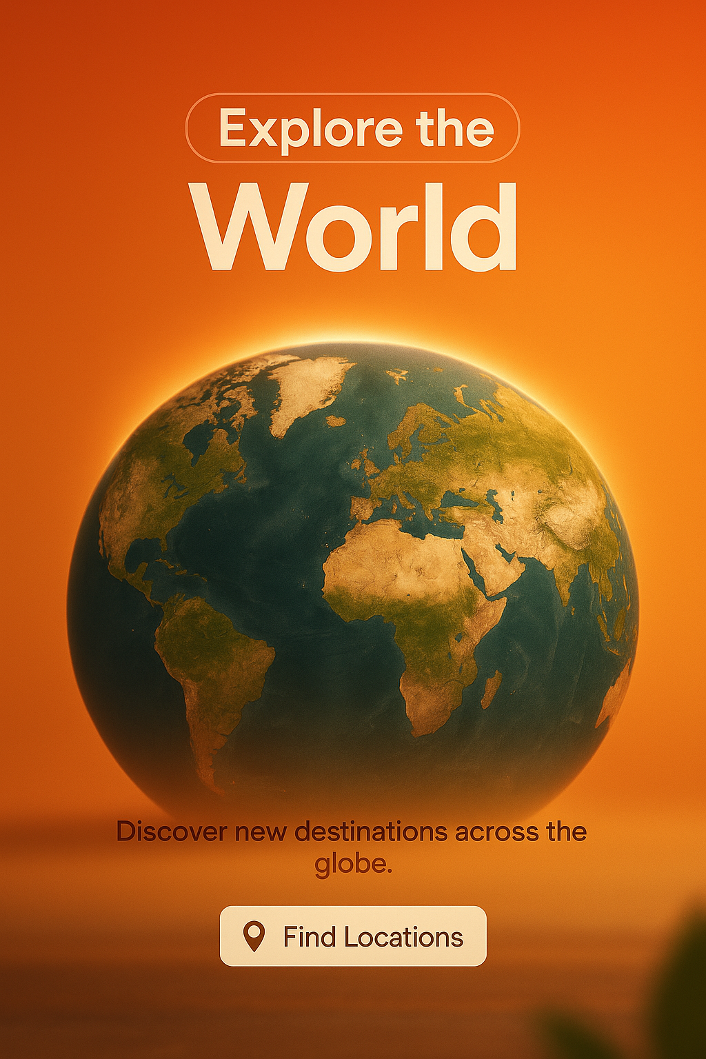 /Collection: /by davooda/Type: PNG/This is a promotional graphic featuring a globe against an orange background, ideal for travel and adventure-themed content. The design is modern and inviting, targeting explorers and travelers.