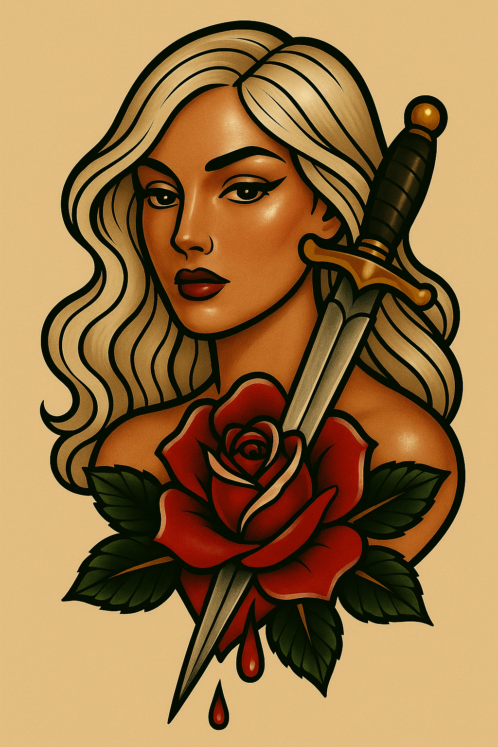 Stylized Tattoo of a Woman with a Rose and Dagger