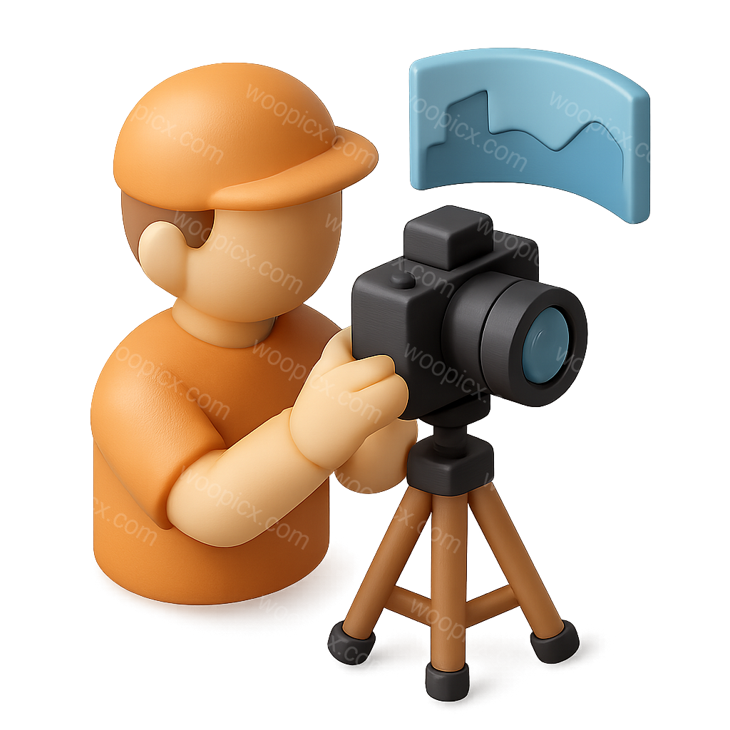 /Premium/Collection: /by davooda/Type: PNG/A 3D icon featuring a photographer in a three-quarter view, holding a camera on a tripod, complemented by a panoramic image behind them, all designed with a volumetric feel.