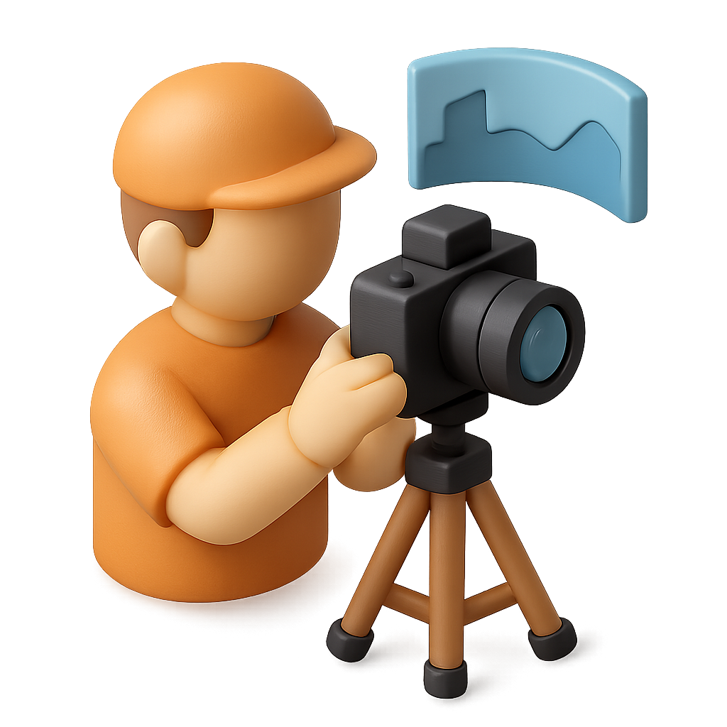 /Collection: /by davooda/Type: PNG/A 3D icon featuring a photographer in a three-quarter view, holding a camera on a tripod, complemented by a panoramic image behind them, all designed with a volumetric feel.