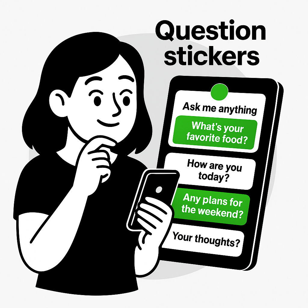 A minimalist illustration depicting a person interacting with a phone displaying question stickers, ideal for social media engagement or app design.