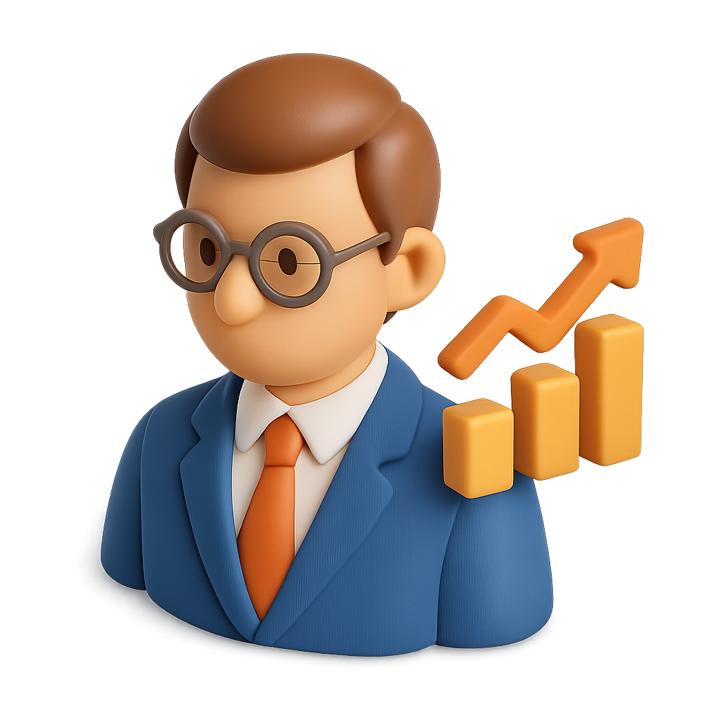 /Collection: /by davooda/Type: PNG/A 3D icon representing a broker, featuring a character with glasses and a suit, complemented by a rising graph. The design has a transparent background and a three-quarter isometric view.