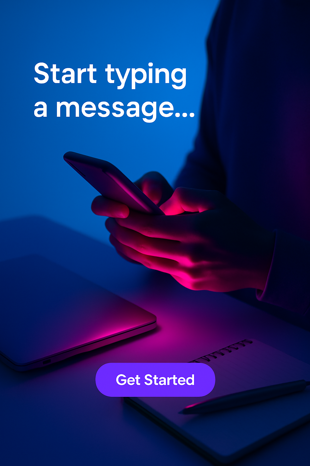 /Collection: /by davooda/Type: PNG/A person holding a phone, illuminated by a vibrant neon-pink glow while typing a message. The scene features a solid blue background, enhancing the glowing effect and creating a cool atmosphere.