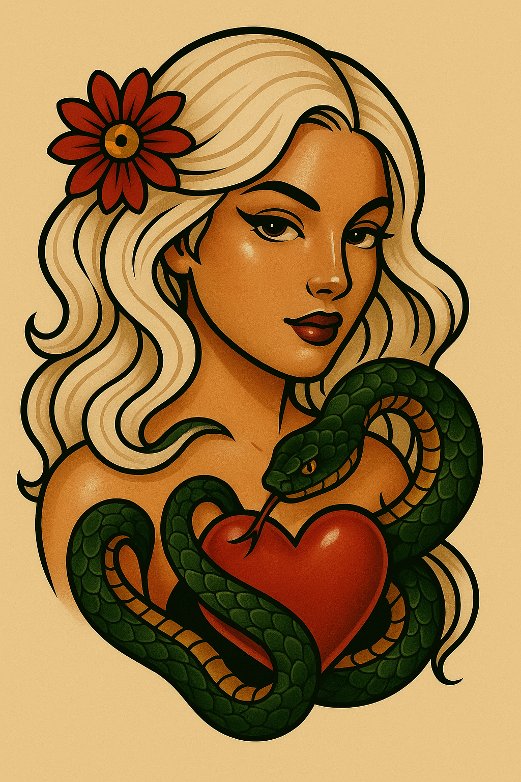 Stylized Woman with Snake and Apple in Tattoo Art Style