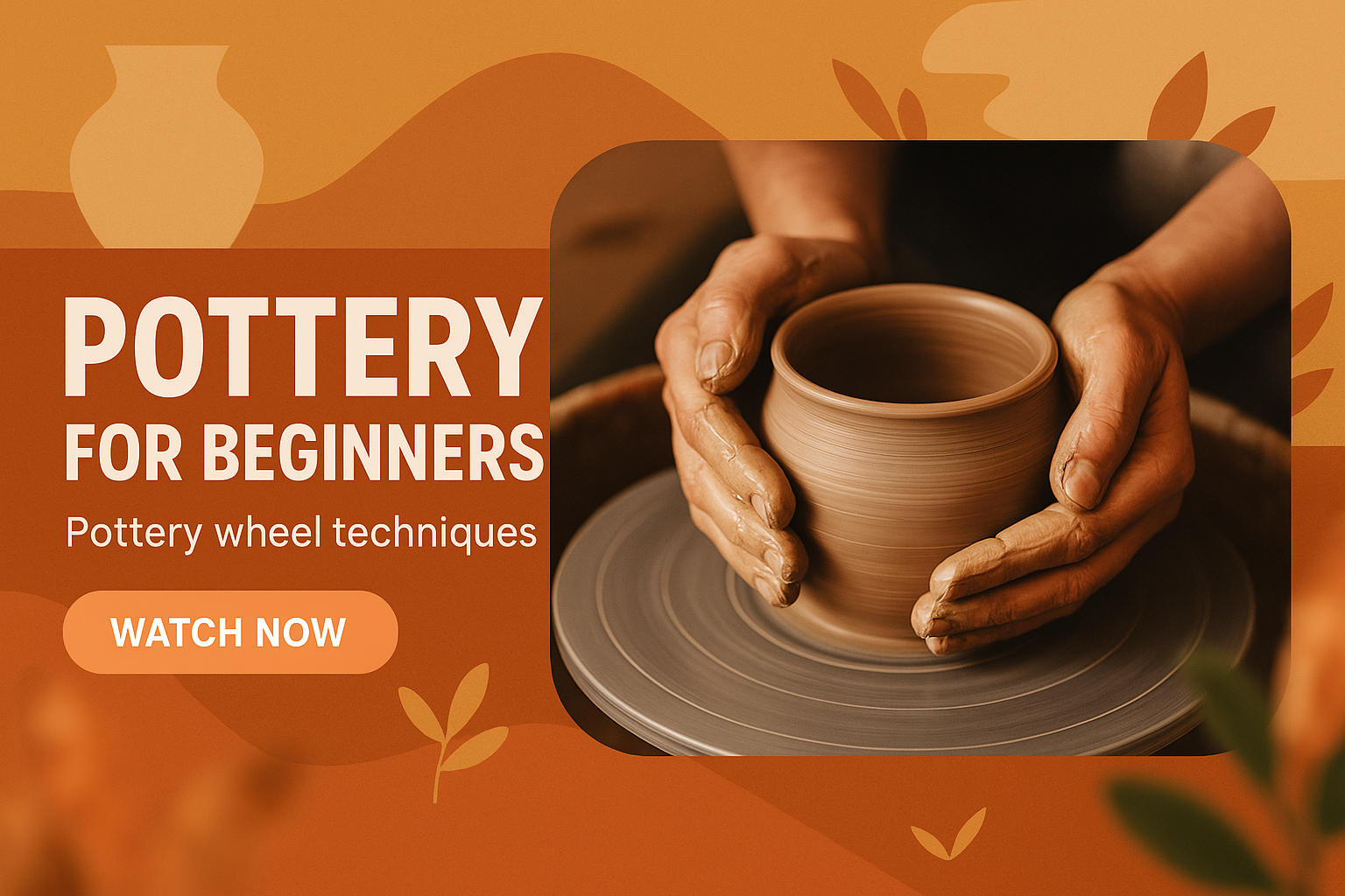 Inviting graphic showcasing pottery techniques for beginners, featuring warm colors and a focus on hands shaping clay, ideal for educational content.