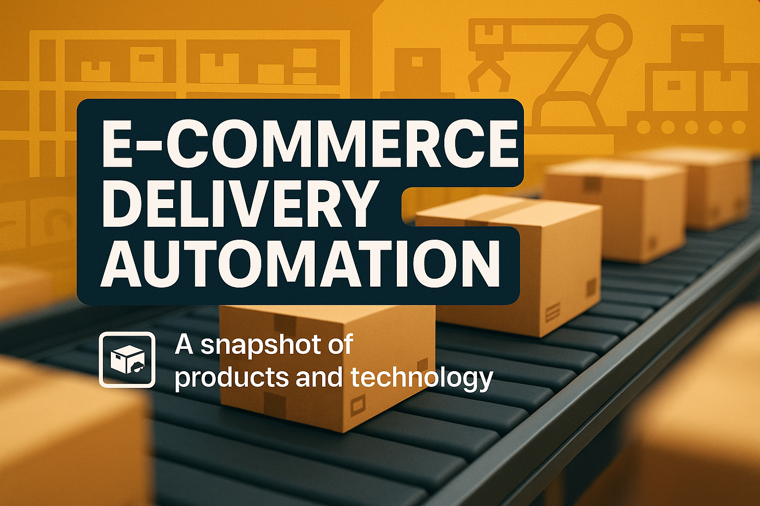 /Collection: /by davooda/Type: PNG/A visually engaging graphic illustrating e-commerce delivery automation, featuring boxes on a conveyor belt and a tech backdrop, ideal for industry presentations.