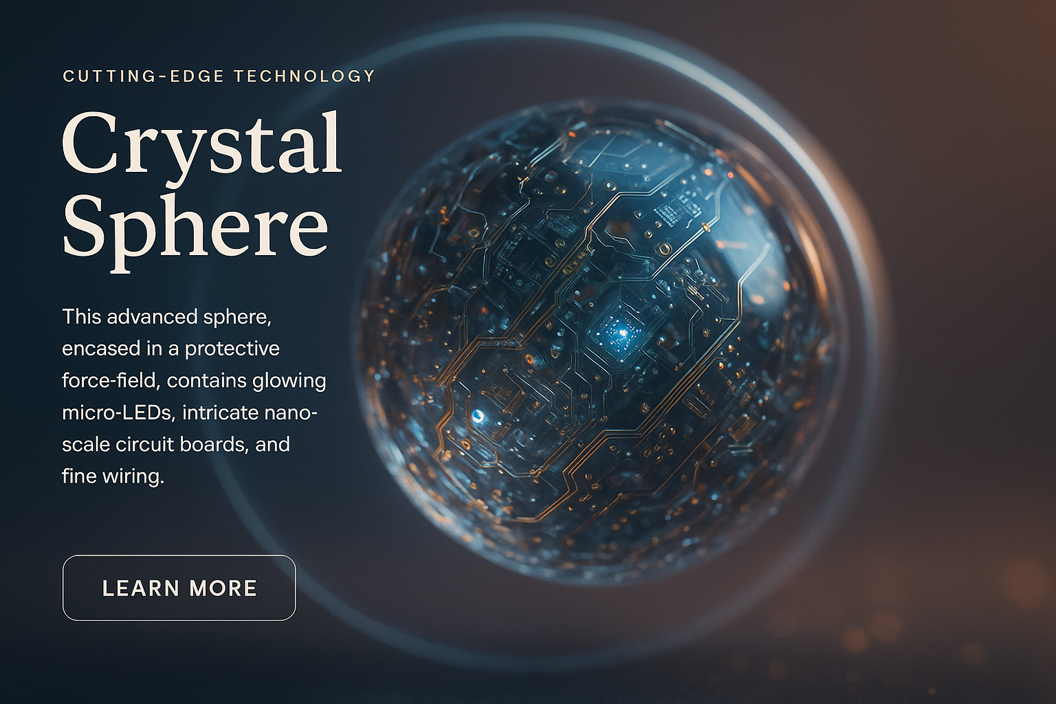 /Collection: /by davooda/Type: PNG/A hyperrealistic depiction of a crystal sphere, showcasing intricate micro-LEDs and nano-scale circuit boards within a force field. The design features metallic components reflecting ambient light, set against a gradient background.