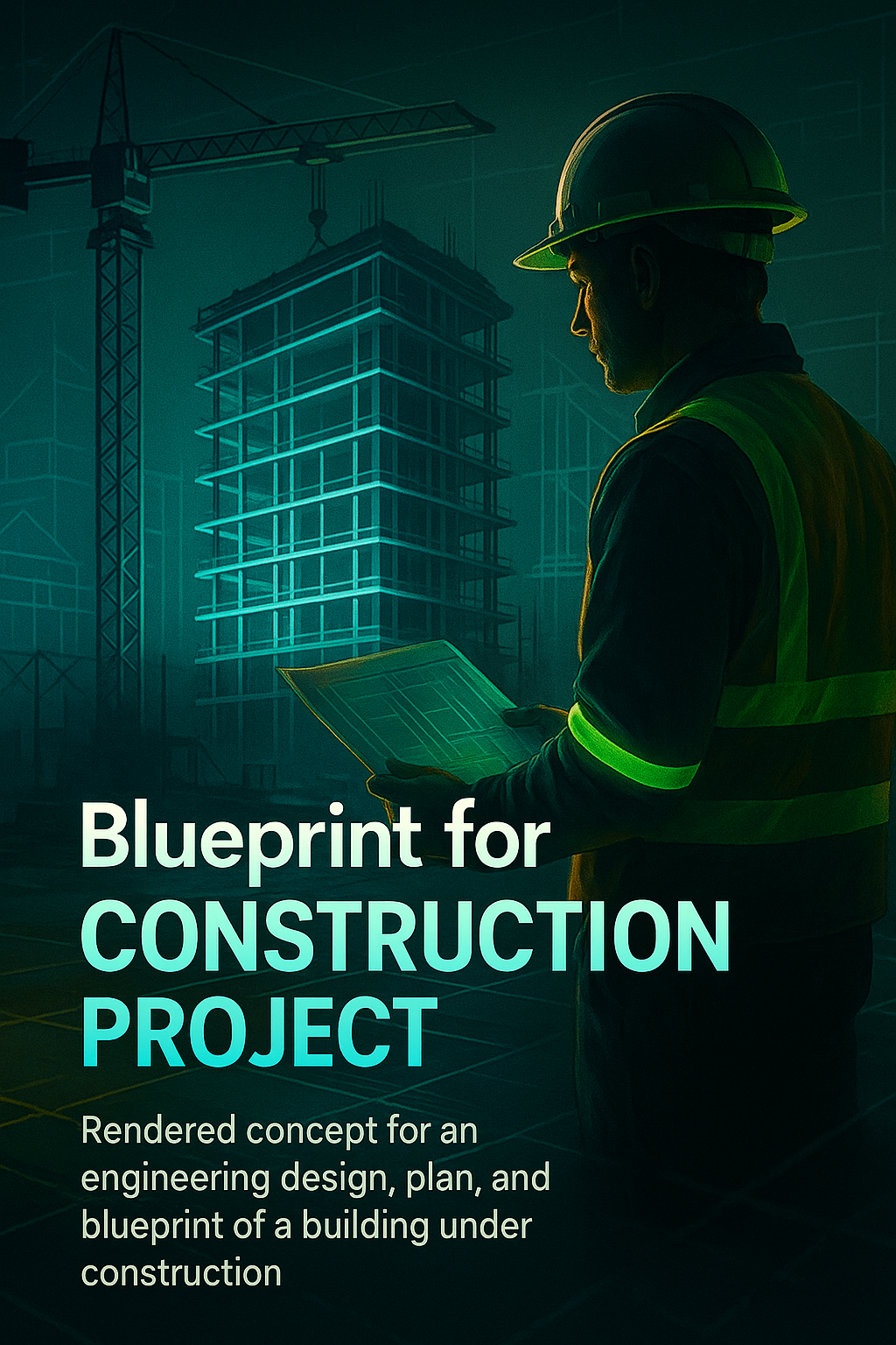 /Collection: /by davooda/Type: PNG/Illustrative graphic depicting a construction worker reviewing a blueprint, with a building under construction in the background. Ideal for engineering and architectural presentations.