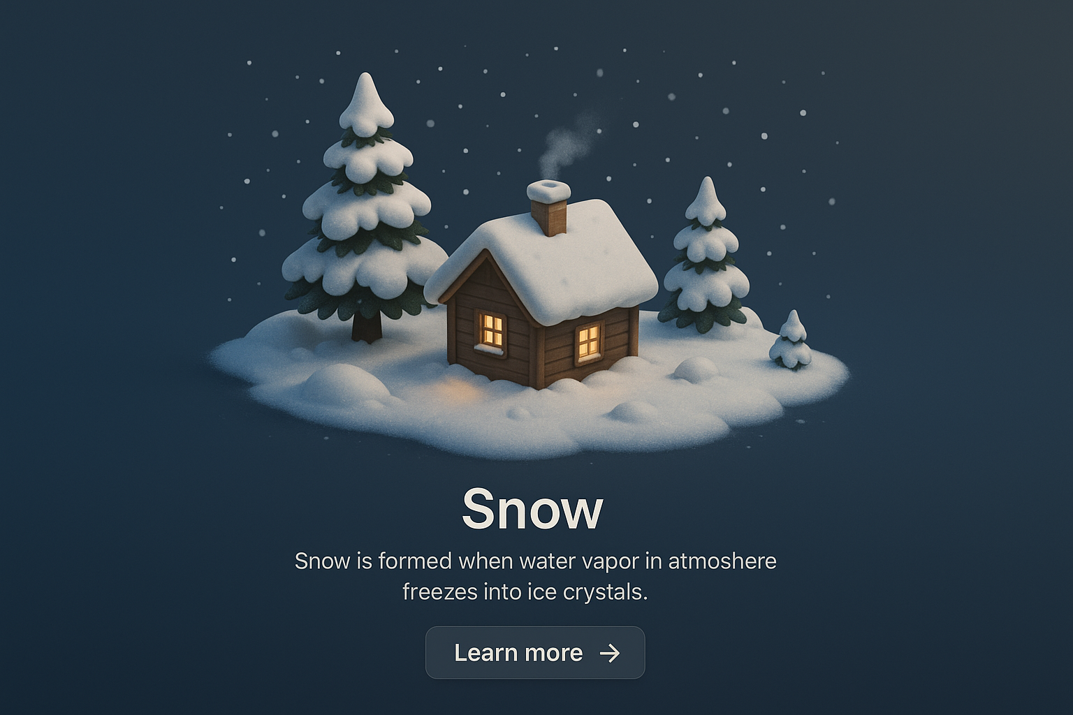 A detailed 3D scene depicting a cozy cabin surrounded by snow-covered trees, set against a dark gradient background. Snowflakes gently fall, enhancing the wintry atmosphere.