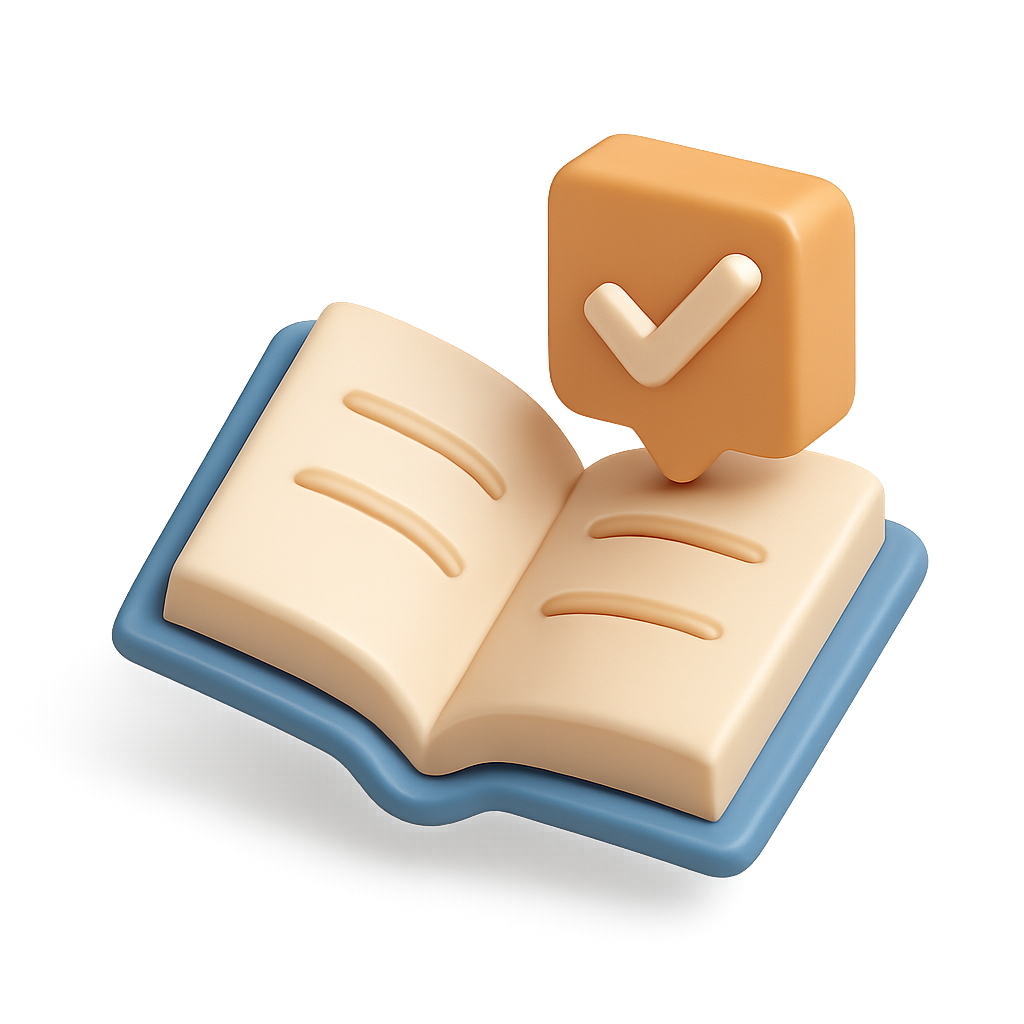 A visually appealing 3D isometric icon depicting an open book with a checkmark symbol above it. The design uses a transparent background and showcases volumetric elements.