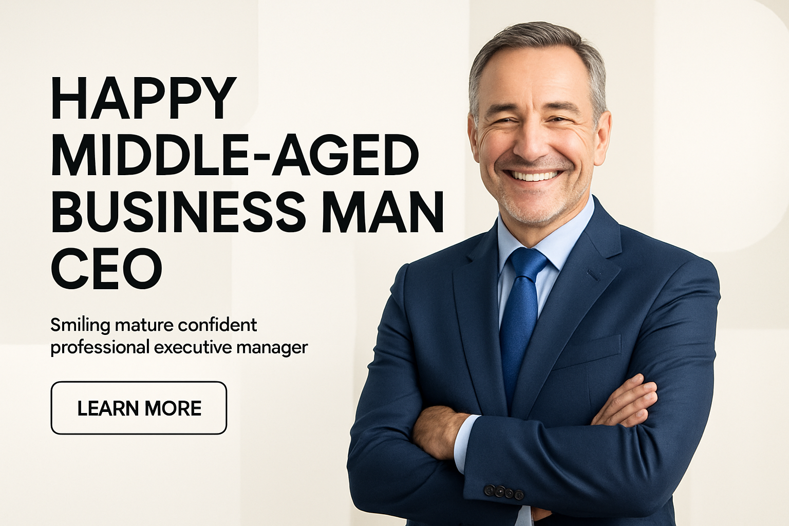 A smiling middle-aged businessman stands confidently in an office, arms crossed. Dressed in a blue suit, he exudes professionalism against a bright, geometric background.