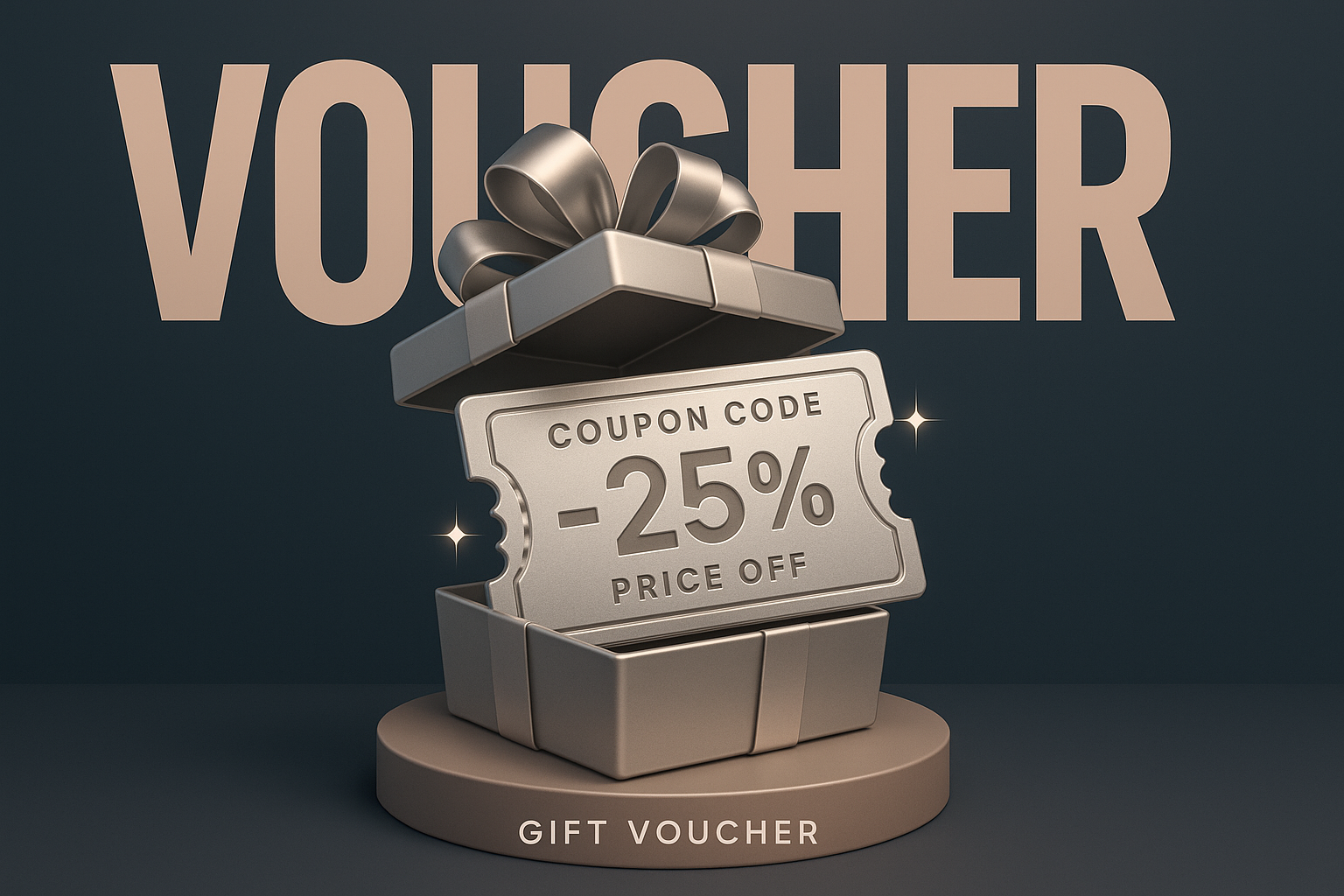 /Collection: /by davooda/Type: PNG/A hyper-realistic 3D platinum coupon with a discount code, placed in an opened gift box on a podium. The background features a modern, minimalistic design with large bold text.