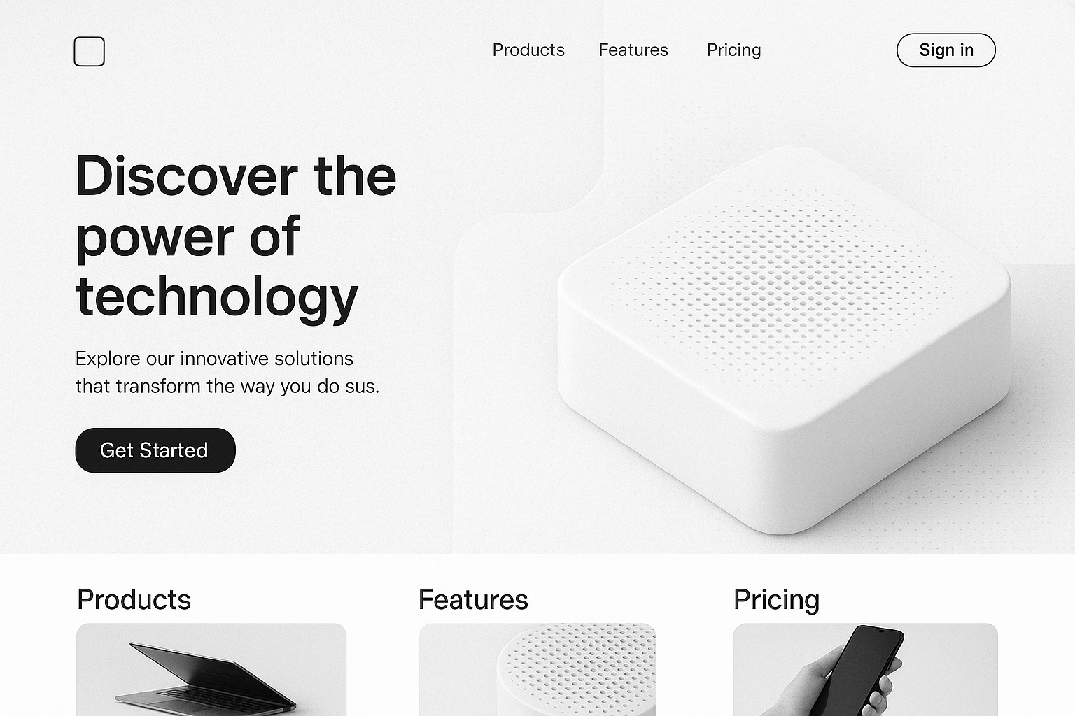 /Collection: /by davooda/Type: PNG/A clean and modern landing page featuring a bold headline, a call-to-action button, and sections for products, features, and pricing. The design emphasizes clarity and balance with a light technology texture background.