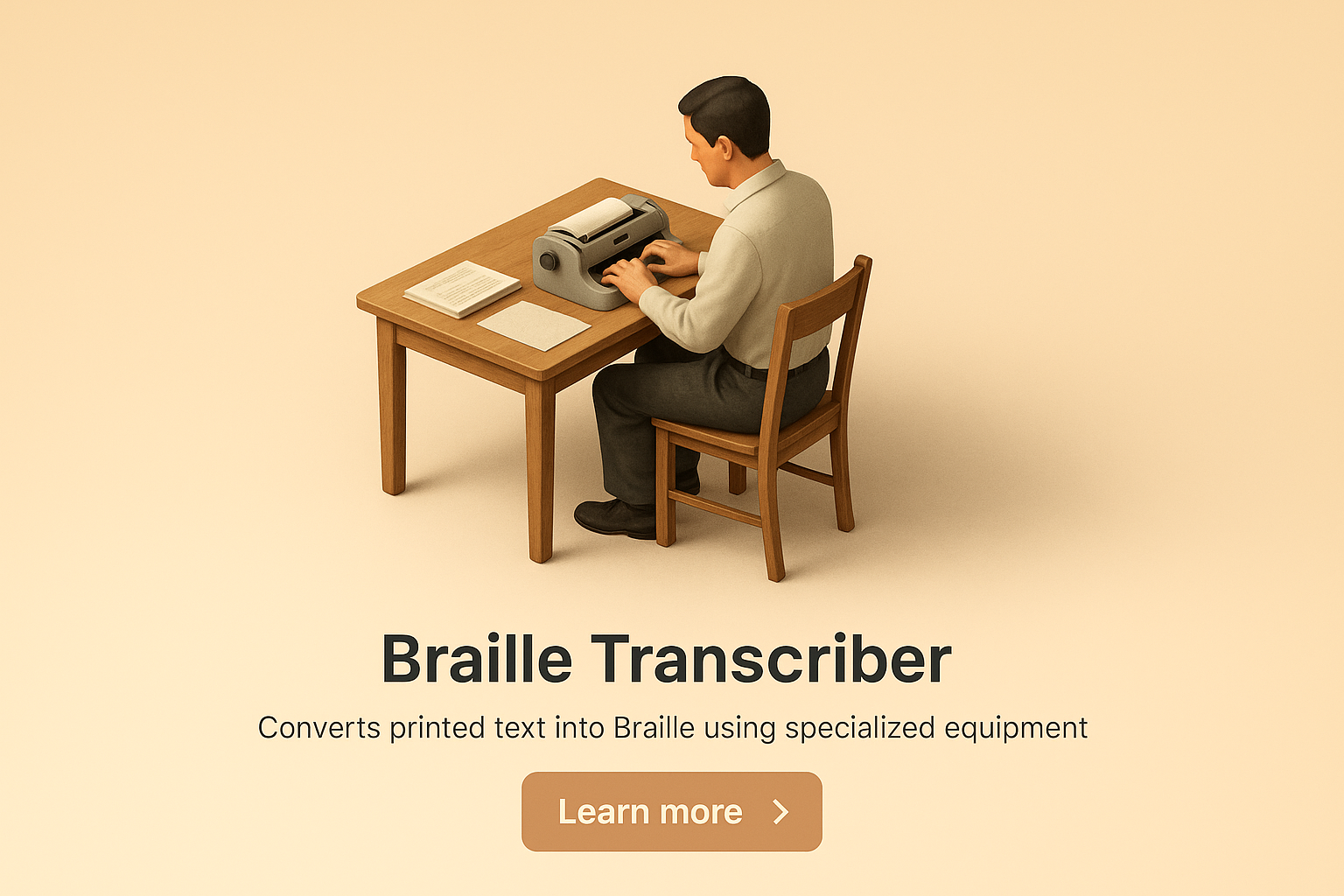 A realistic 3D representation of a Braille transcriber sitting at a table, working with a specialized device. The scene is zoomed out to show the environment and context.