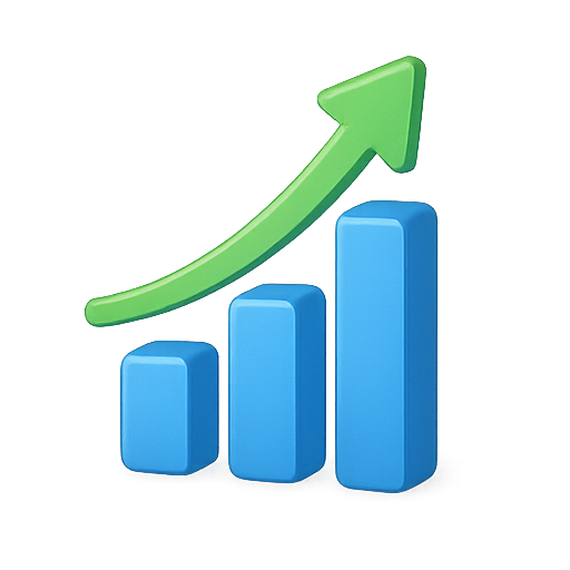 /Collection: /by davooda/Type: PNG/A modern, stylized bar graph icon featuring three blue bars of increasing height and a green upward arrow, symbolizing growth and success, suitable for business and financial contexts.