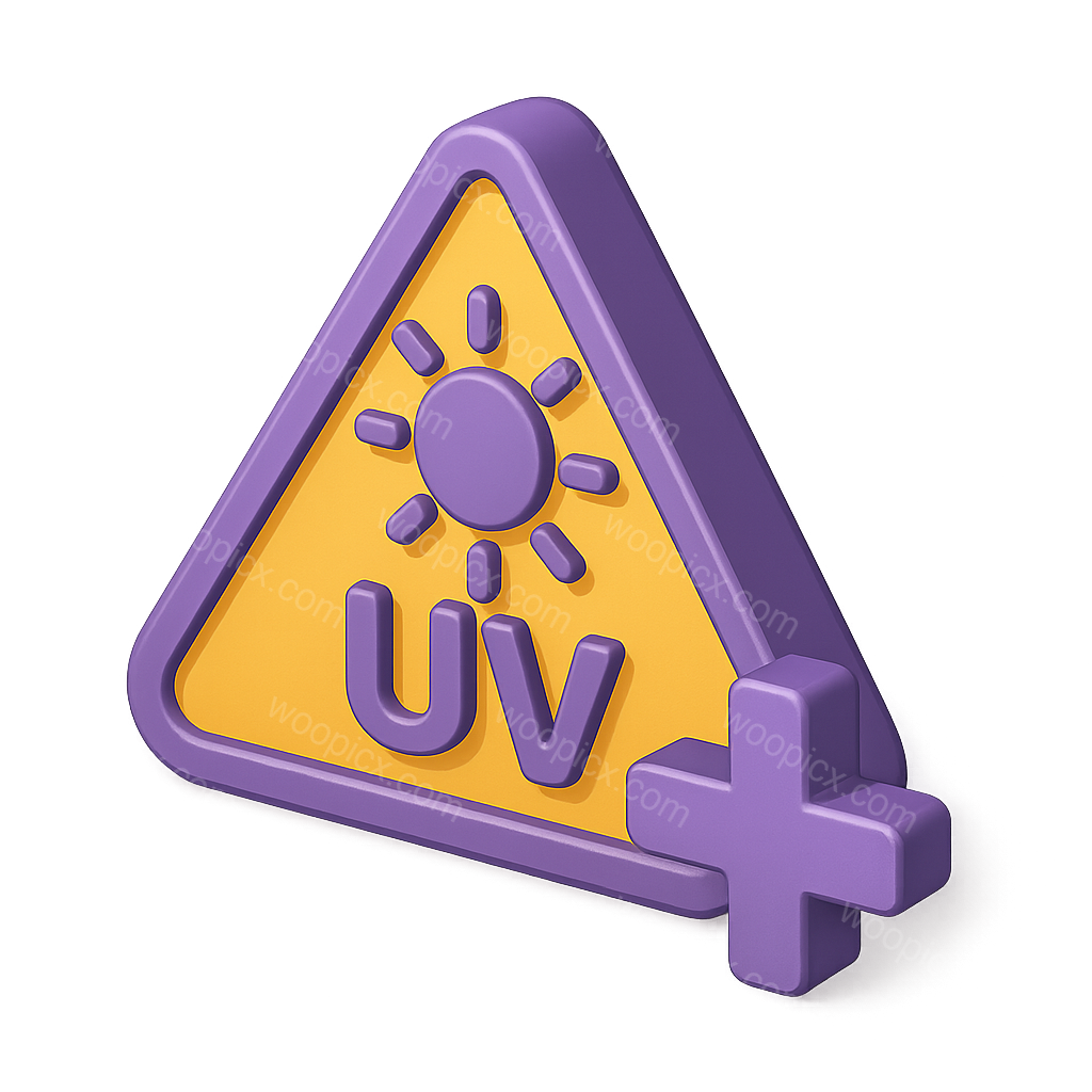 This image features a vibrant 3D icon representing ultraviolet light, designed in a triangular shape with a sun symbol and a plus sign, emphasizing UV awareness.