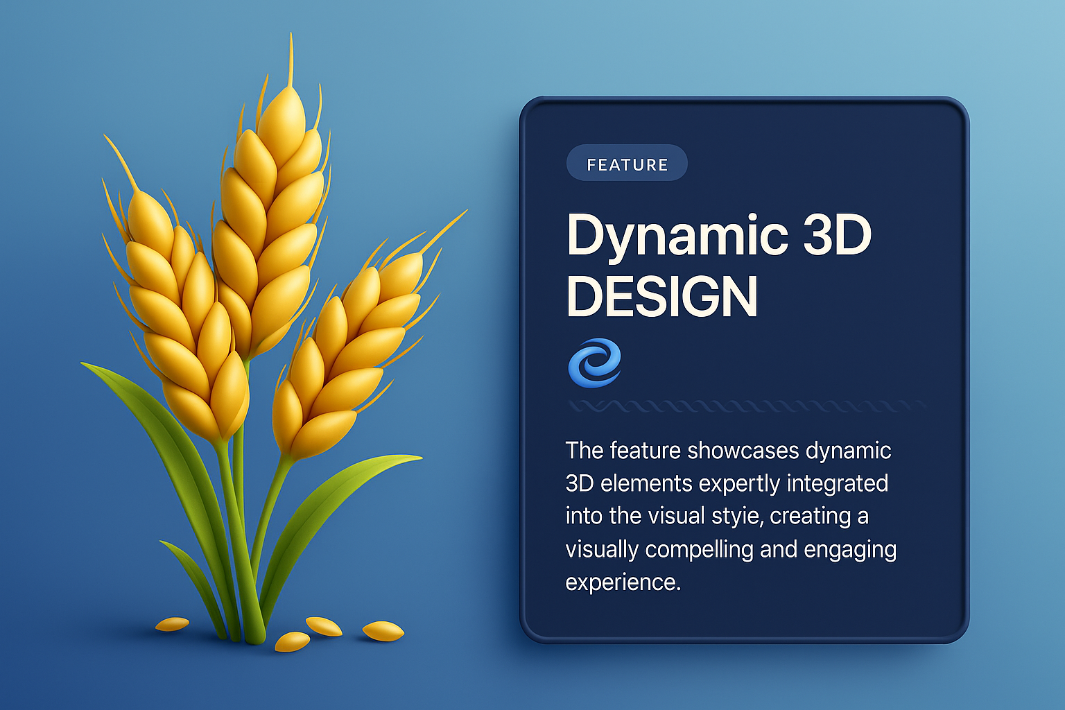 /Collection: /by davooda/Type: PNG/A visually striking 3D illustration of wheat ears against a smooth gradient background. The design features a block with integrated text and graphics, enhancing the overall composition.