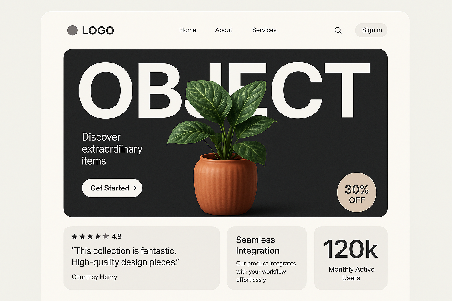 A sleek and modern landing page design featuring a large 3D plant as the focal point, bold typography, and a minimalistic layout, emphasizing clarity and elegance.