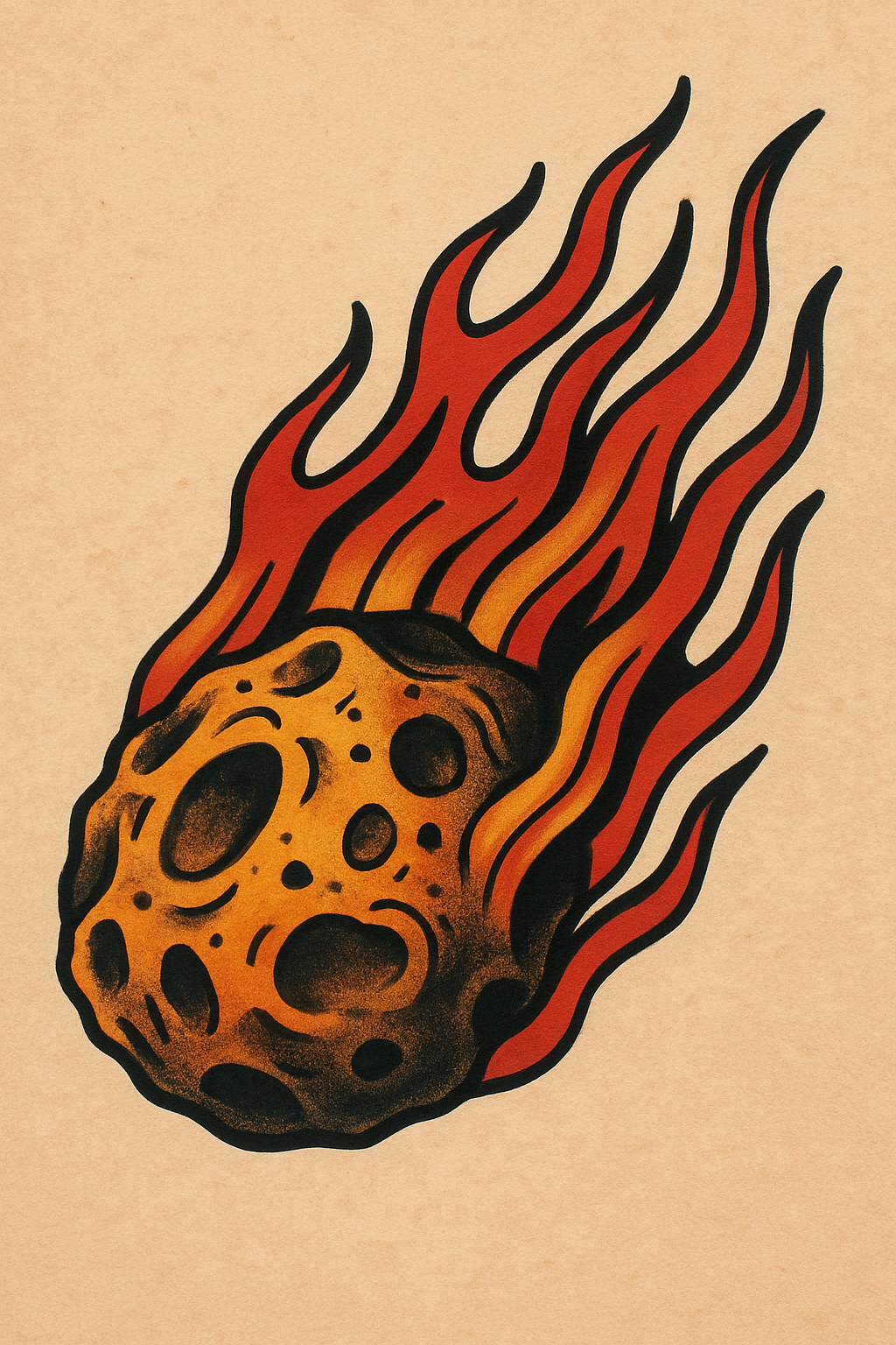 /Collection: /by davooda/Type: PNG/This image features a stylized illustration of a meteor engulfed in flames. The design combines bold colors and sharp lines, making it suitable for digital art, merchandise, or promotional materials.