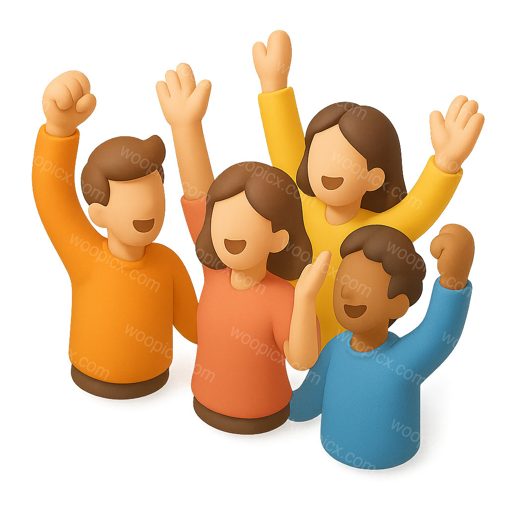 A vibrant 3D illustration featuring four cheerful characters celebrating with raised arms, showcasing a dynamic and joyful atmosphere in a volumetric style.