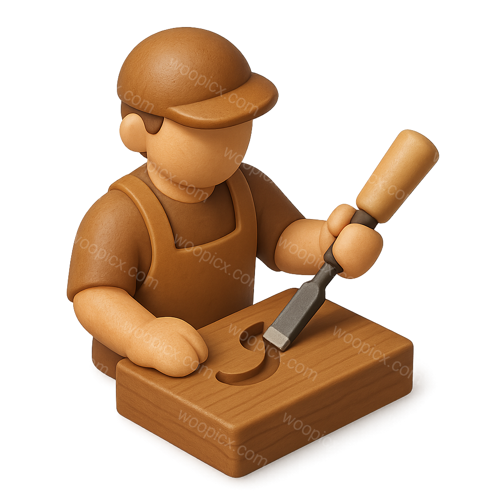 A stylized 3D icon depicting a woodcarver using a chisel on a wooden block. The figure features a simplistic design with a three-quarter view, enhancing its volumetric appearance.