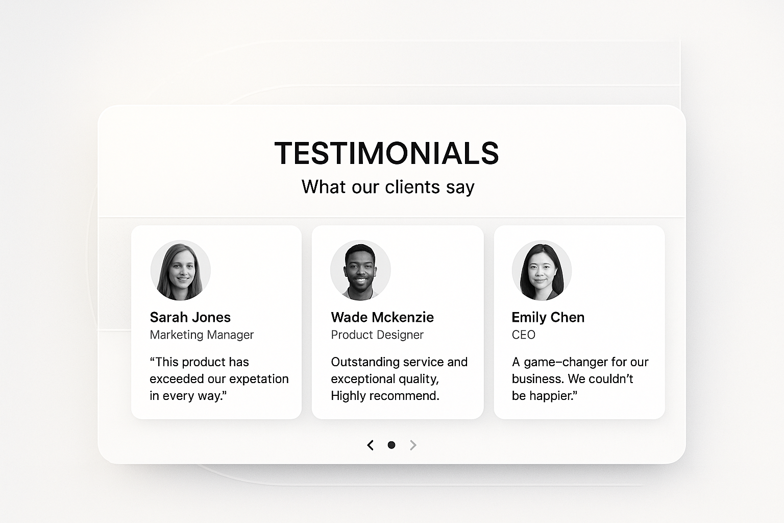 /Collection: /by davooda/Type: PNG/A sleek testimonials section featuring three cards with author photos, names, positions, and quotes. The design includes carousel navigation elements, set against a smooth gradient background.