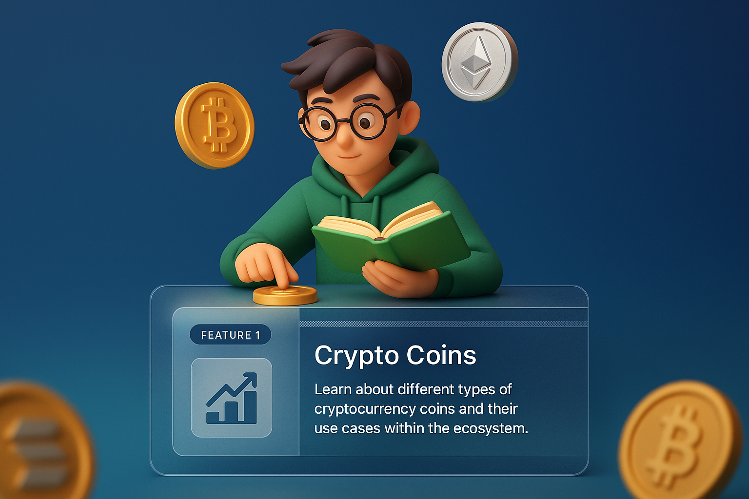 /Collection: /by davooda/Type: PNG/A young individual is engrossed in studying cryptocurrency coins, surrounded by 3D graphics. The image features a book, various crypto coins, and a visually appealing information block.