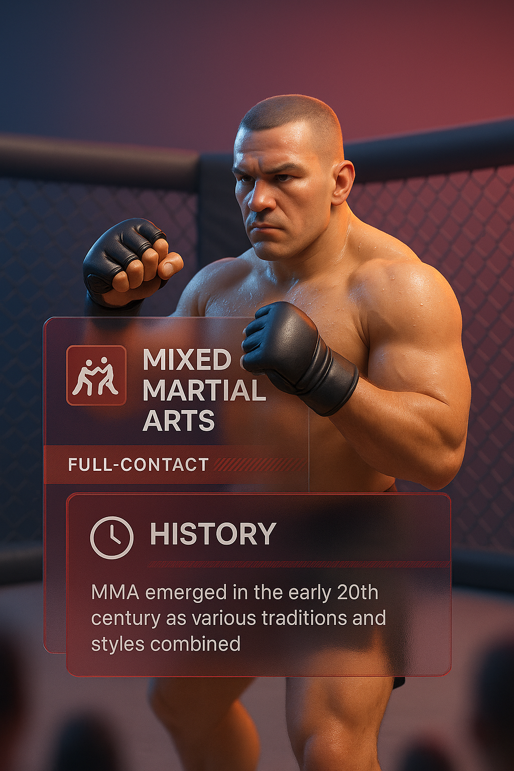 /Collection: /by davooda/Type: PNG/A striking 3D illustration featuring a mixed martial artist with integrated design elements. The background showcases a smooth gradient, while the text block highlights the history of MMA.
