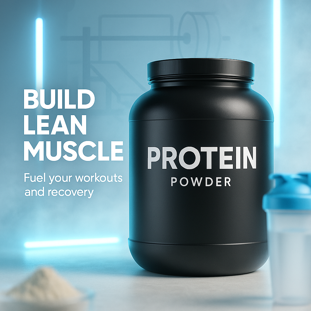 /Collection: /by davooda/Type: PNG/Promotional image showcasing a protein powder container, designed to attract fitness enthusiasts. The modern visual style features a sleek black container with a minimalist aesthetic, ideal for health and wellness marketing.