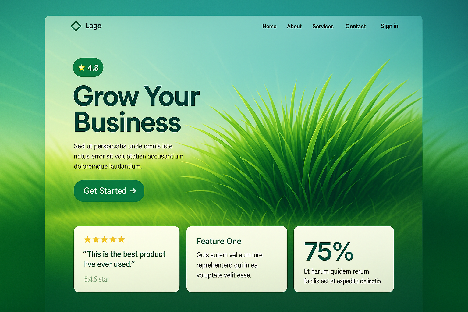 A visually appealing landing page featuring a vibrant grass background, a bold title, and dynamic elements. It includes sections for testimonials, features, and stats.