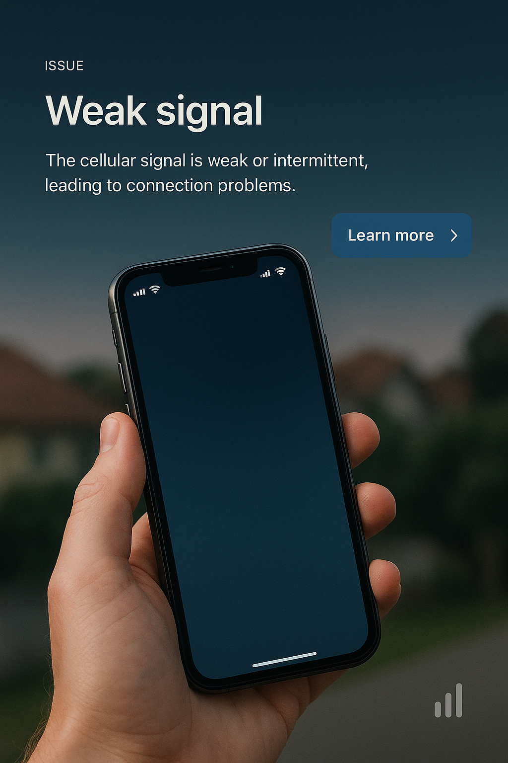 /Collection: /by davooda/Type: PNG/A sleek web page design featuring a smartphone displaying a weak signal alert. The background features a gradient, enhancing readability with minimalist elements.